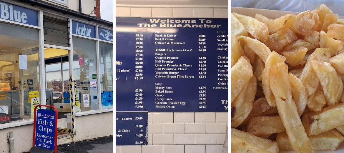 WOW! Excellent Cod and Chips, Haddock and chips ,crispy and tasty batter from the Blue Anchor, never tried them before. Was in Bexhill-on-Sea on a day trip and and wanted to watch the sunset while having fish and chips, wasn't disappointed, great fish and chips and beautiful sunset. Dedicated parking on the side street is a real bonus. Friendly and helpful staff, very clean .